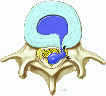 El anillo fibroso se rompe y parte del núcleo pulposo se desplaza hacia el canal espinal.